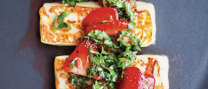 - Heat a chargrill or barbecue grill on high and lightly brush the haloumi with the remaining olive oil. Cook haloumi in batches for one minute on each side or until charred. Place haloumi on a serving platter, top with the strawberry mixture and serve straight away.