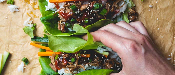 - To assemble, take a piece of butter lettuce, add a small scoop of rice and teriyaki jackfruit and top with cucumbers, carrots, green onions and sesame seeds. Finish with a drizzle of teriyaki sauce.